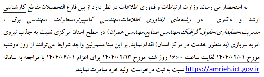 چهارمین مرحله جذب نیروی امریه سربازی در وزارت ارتباطات و فناوری اطلاعات ۲۷ فروردین ۱۴۰۴ | ۱۵:۱۱ کد : ۵۰۸۰۸ اطلاعیه ارسال به دیگران نام شما ایمیل شما ایمیل دریافتکننده ارسال انصراف تعداد بازدید:۴۲۶۰ فراخوان چهارمین مرحله جذب نیروی امریه سربازی در وزارت ارتباطات و فناوری اطلاعات