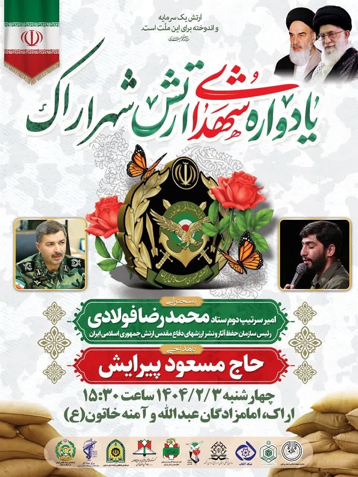 مراسم یادواره شهدای ارتش شهرستان اراک ، روز سوم اردیبهشت ماه ، در بارگاه مطهر امامزادگان آمنه خاتون و عبدالله(ع) ، با حضور مسئولین کشوری و استانی برگزار میشود.