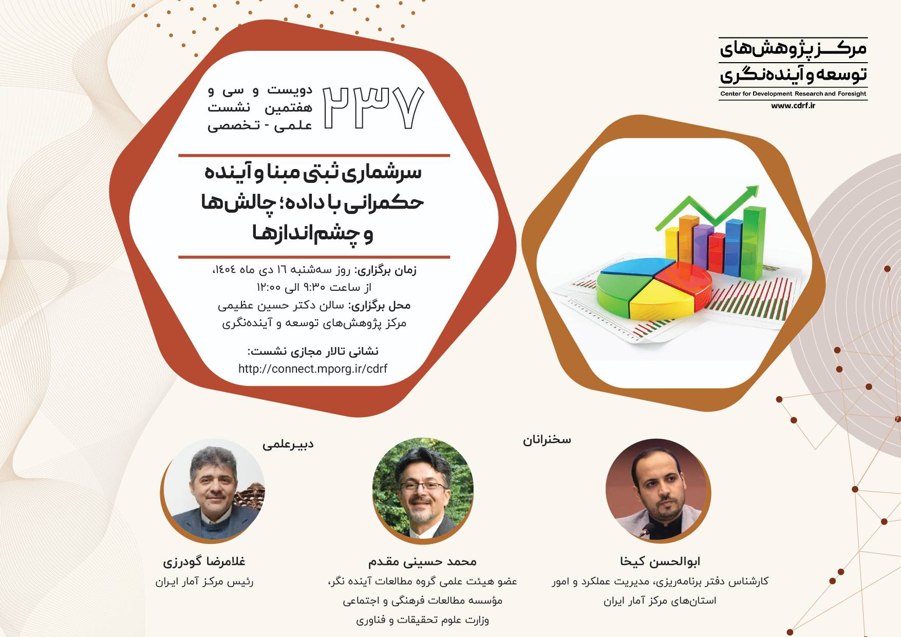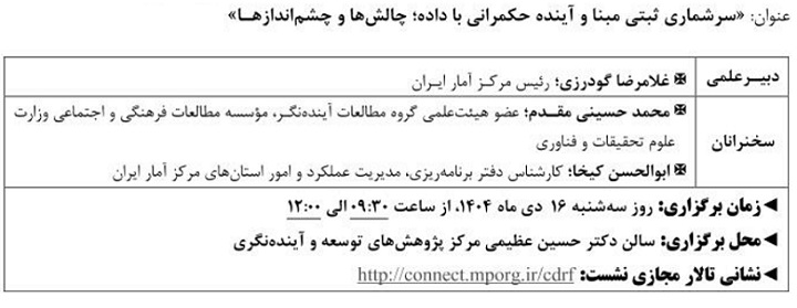 نشست علمی سرشماری ثبتی مبنا آینده حکمرانی با داده ۱۴ دی ۱۴۰۴ | ۱۰:۲۱ کد : ۵۷۴۱۸ اطلاعیه ارسال به دیگران نام شما ایمیل شما ایمیل دریافتکننده ارسال انصراف تعداد بازدید:۵۵۰ دویست وسی وهفتمین نشست علمی - تخصصی با عنوان سرشماری ثبتی مبنا آینده حکمرانی با داده، چالش ها وچشم اندازها