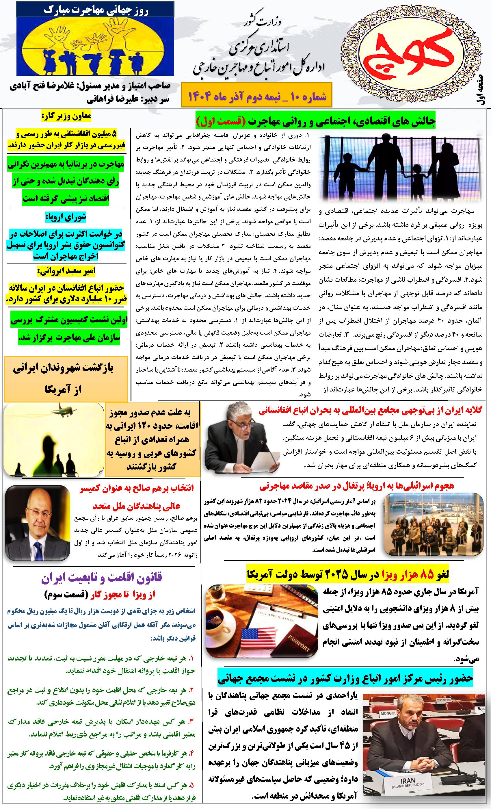 دهمین شماره نشریه کوچ ۰۳ دی ۱۴۰۴ | ۰۹:۲۱ کد : ۵۷۵۲۰ اطلاعیه ارسال به دیگران نام شما ایمیل شما ایمیل دریافتکننده ارسال انصراف تعداد بازدید:۱۰۳ دهممین شماره نشریه کوچ، توسط دفتر امور اتباع و مهاجرین خارجی استان مرکزی منتشر گردید.