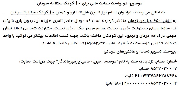 درخواست حمایت مالی، برای ۱۰ کودک مبتلا به سرطان ۰۷ بهمن ۱۴۰۴ | ۱۱:۳۳ کد : ۵۷۷۳۲ اطلاعیه ارسال به دیگران نام شما ایمیل شما ایمیل دریافتکننده ارسال انصراف تعداد بازدید:۱۶۷ موسسه خیریه حامی یار، درخواست حمایت مالی، برای ۱۰ کودک مبتلا به سرطان را دارد.